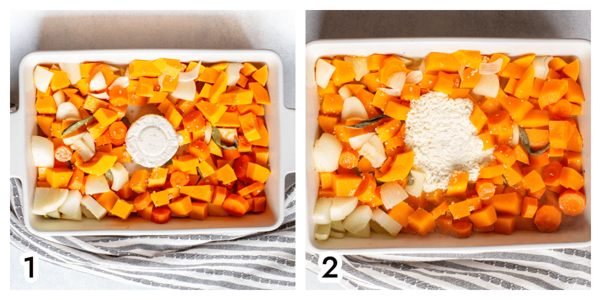 Photo 1. Prep the vegetables and add them to a 9x13" baking dish along with the sage. Drizzle with olive oil and season with salt and pepper. Nestle the Boursin cheese into the veggies.