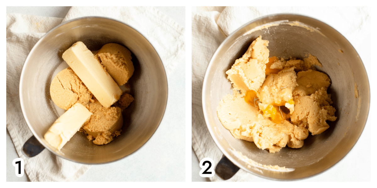 - In a large bowl with an electric mixer, beat together the butter, brown sugar, and granulated sugar until creamy.