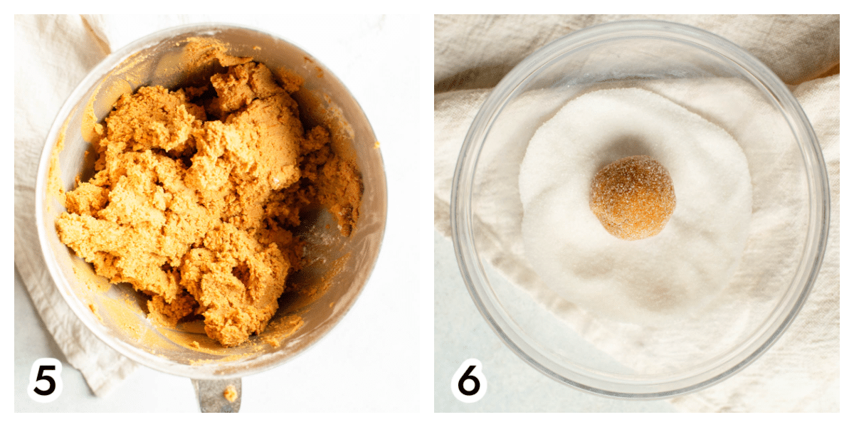 Photo 6. Using a cookie scoop, roll the cookie dough into balls and roll in sugar.