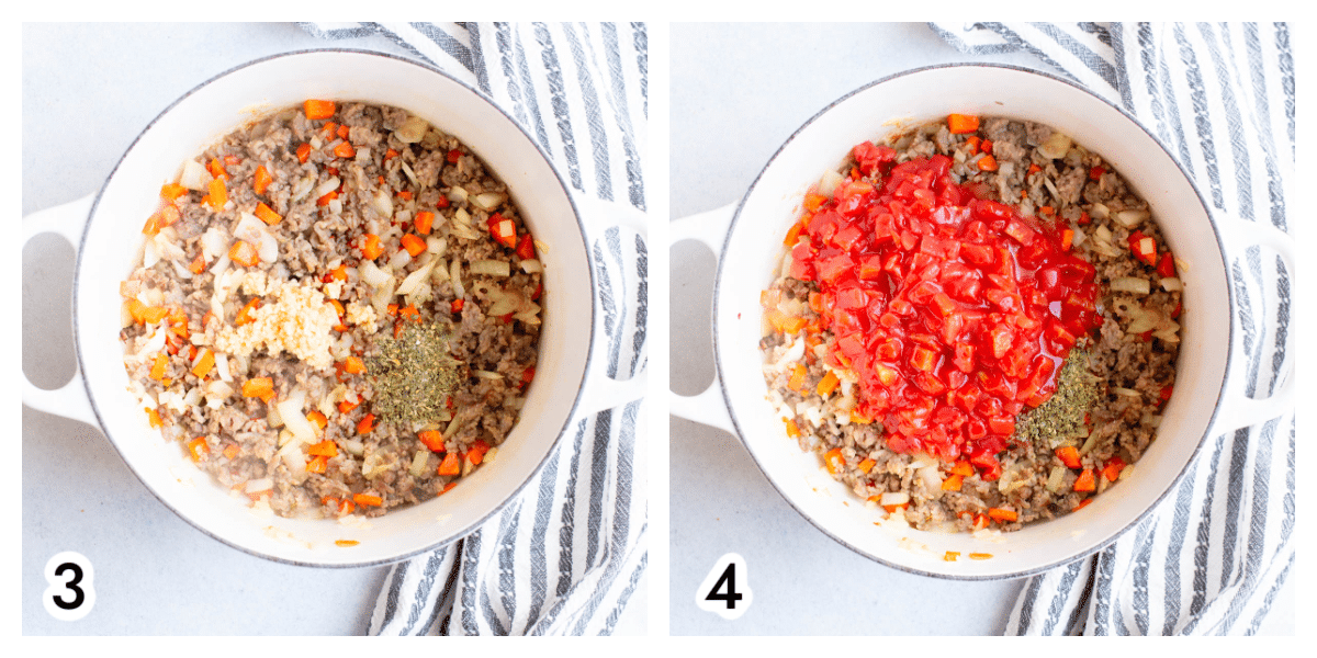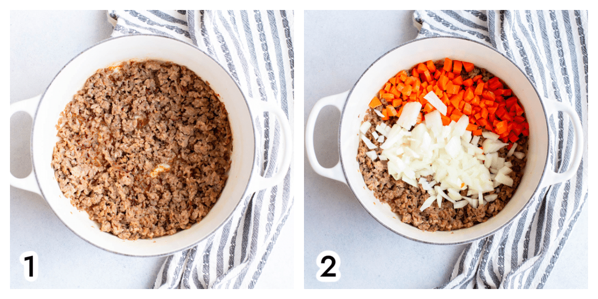 - Add the sausage, breaking into smaller pieces as it browns.