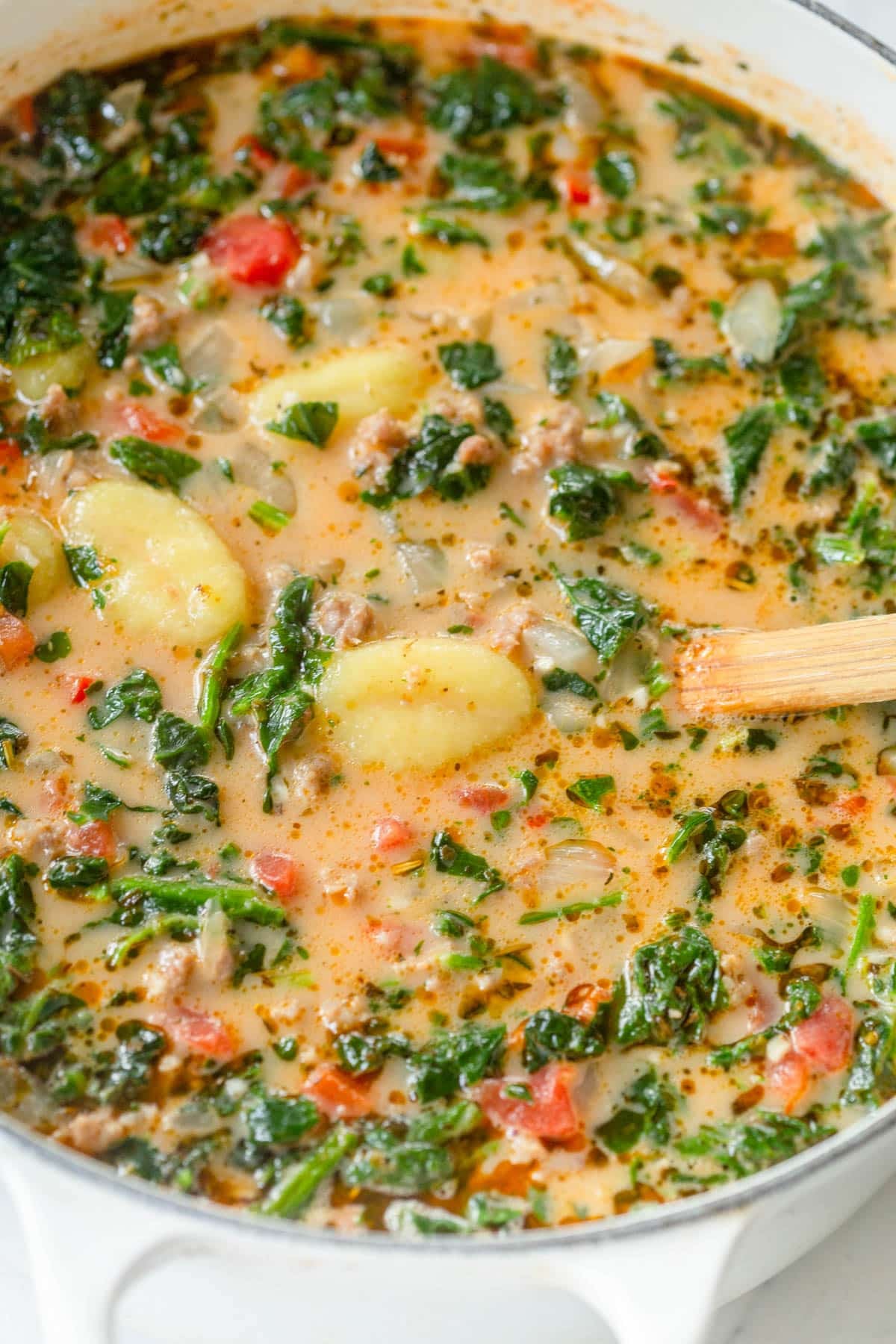 Italian Sausage Gnocchi Soup is an easy and comforting soup recipe that has Italian sausage, Italian diced tomatoes, onion, red bell pepper, spinach, broth, Italian seasonings, and gnocchi! It is ready in 30 minutes and is a soup the entire family will devour.