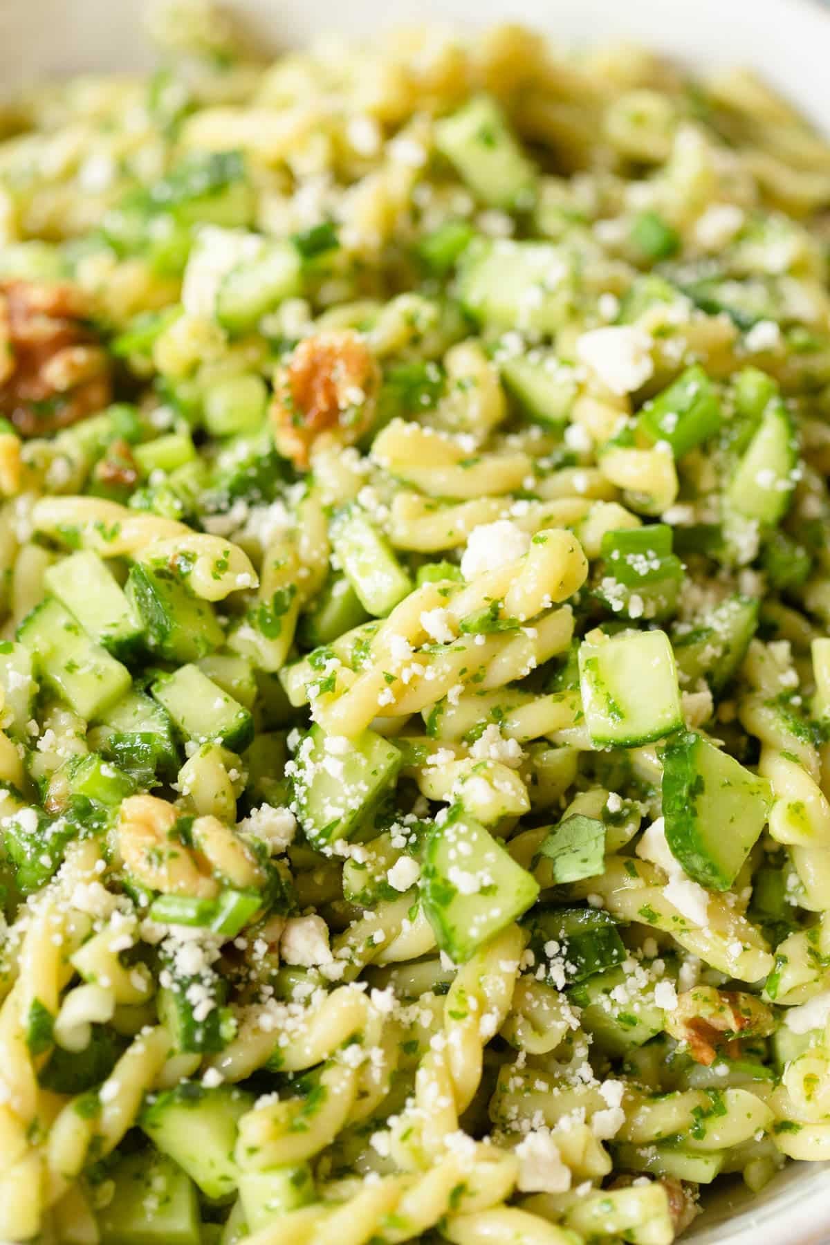6. In a large bowl, combine the cooked pasta, chopped cucumbers, walnuts, and dressing and stir to combine.