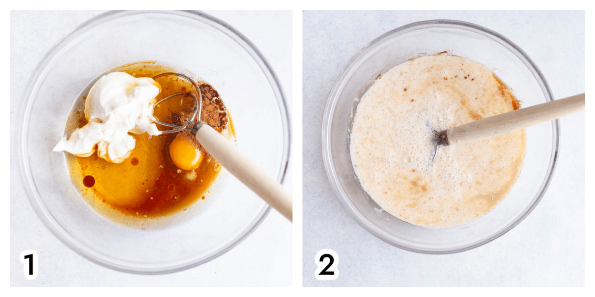 Photo 1. In a large bowl, whisk together the oil, maple syrup, egg, vanilla, and yogurt.