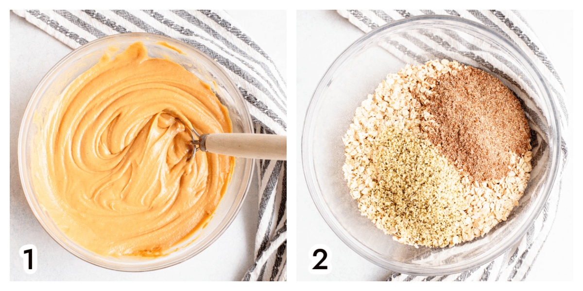 - In a medium bowl, add the peanut butter and honey. Microwave for ~30 seconds to get them warmed a little bit to make them easier to mix.