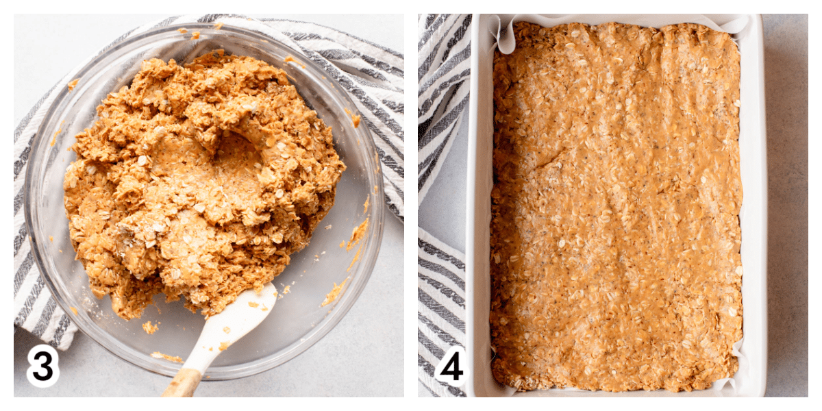 Press the mixture firmly into the pan using a spatula or the bottom of a measuring cup to prevent crumbly bars.