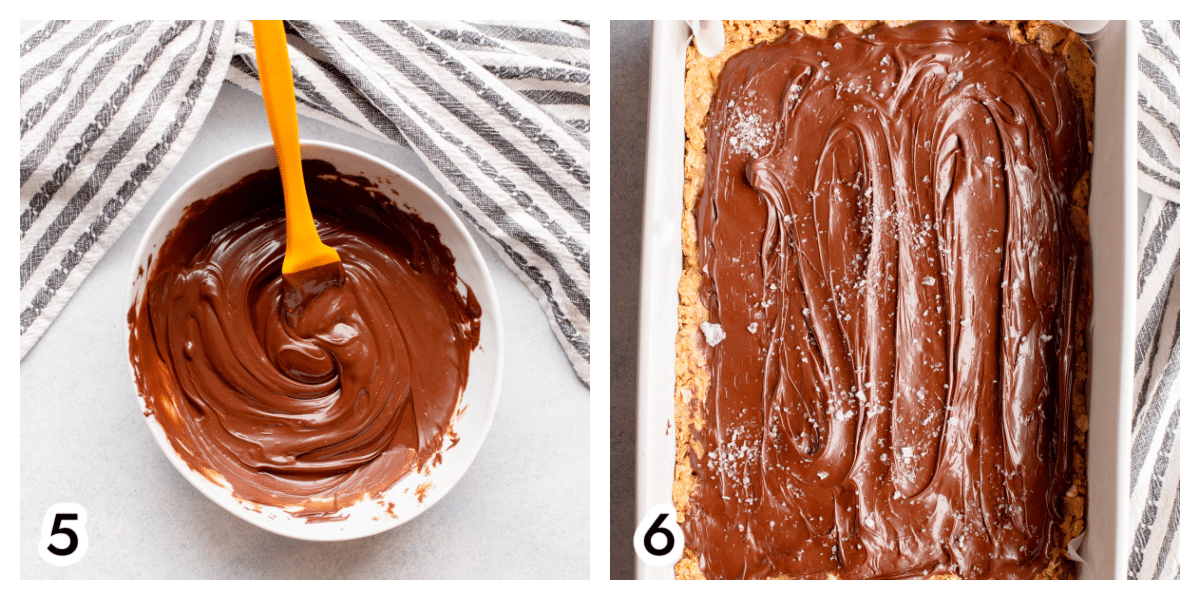 Photo 6. Spread over the bars and then sprinkle with sea salt. Let set. I like to pop them in the fridge for 30 minutes for the chocolate to set up. Slice into bars. Enjoy!