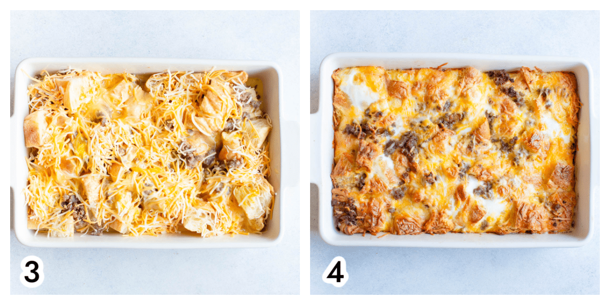 Make Ahead - this recipe is so great for prepping ahead of time and baking in the morning. pull the casserole out of the fridge in the morning while you preheat the oven. You want this sausage croissant casserole to come to about room temperature, which will take around 30 minutes. Bake the casserole in the preheated oven for about 50-55 minutes. It will take a little bit longer than cooking it right away, as the casserole will still be starting from a bit colder since it's been in the fridge.