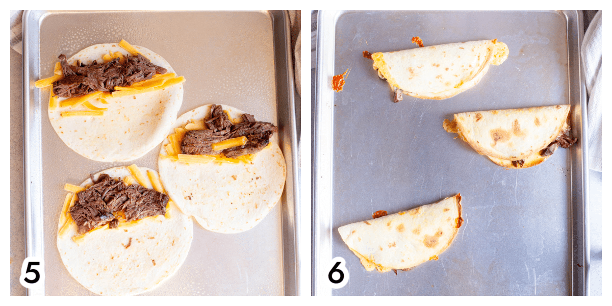 Photo 5. Preheat the oven to 400 degrees F. Grease two baking sheets with cooking spray or brush with olive oil and place the tortillas on the baking sheets. Add cheese and shredded beef to one half of each tortilla and then fold in half, pressing the tortilla down so it stays folded. Spray the top of the tortillas with cooking spray or brush with olive oil.