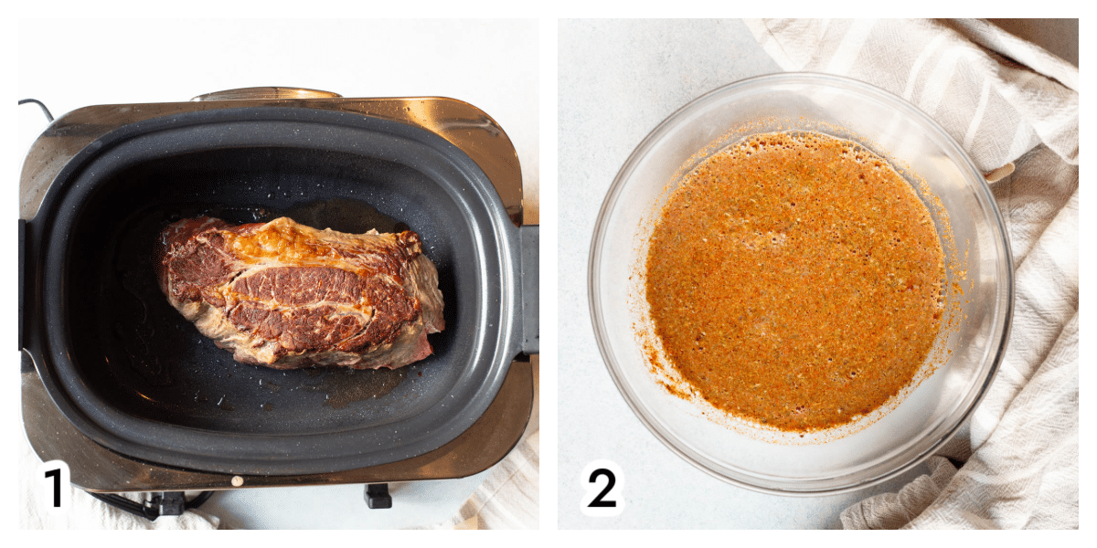 - Sear the chuck roast for 5 minutes on each side, until browned.
